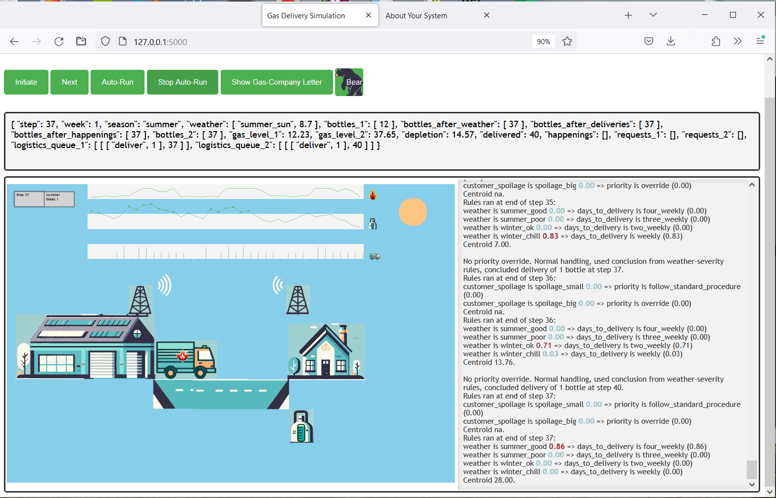 I have built a simulation of gas-delivery logistics, showing how this can be controlled by an expert system. As explained on the main page, this is not yet a commercial product but an MVP — Minimum Viable Prototype. However, it demonstrates the principles, and could be scaled up to a commercial product. I have ensured that it needs no specialist knowledge to understand, so it should be easy for the government inspectors to understand and for you to explain to them. For further information about fuzzy logic and how the expert system works, please see About Fuzzy Logic . I explain these at a non-technical level on the current page.